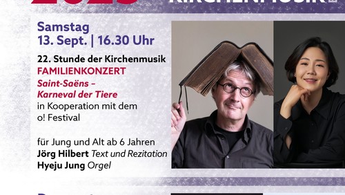 Den Karneval der Tiere von Camille Saint-Saëns kennt fast jeder: Die Musik charakterisiert die unterschiedlichsten Tiere vom Löwen bist hin zu den Fossilien. Der Essener Kinderbuchautor Jörg Hilbert („Ritter Rost“) hat dazu seine eigenen amüsant-hintersinnigen Texte verfasst. Er schildert das Känguru, die Vögel, den Elefanten und Vieles mehr. Selbstverständlich darf auch der berühmten Schwan nicht fehlen. Virtuos begleitet wird er dabei von der Oranistin Hyeju Jung. Ein vergnügliches Konzert für jung und alt (ab 6 Jahre).
