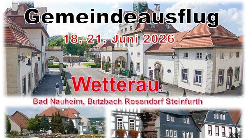 Wir laden ein zum diesjährigen Gemeindeausflug vom 18.-21.6.2026 nach Hessen in die Wetterau ein. Wir besuchen die Jugendstilstadt Bad Nauheim, die Fachwerkstadt Butzbach und das Rosendorf Steinfurth.